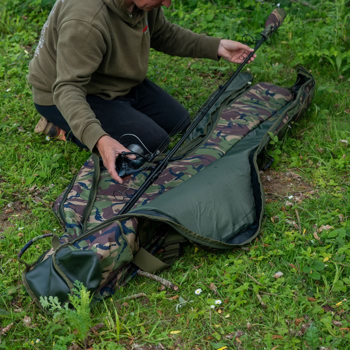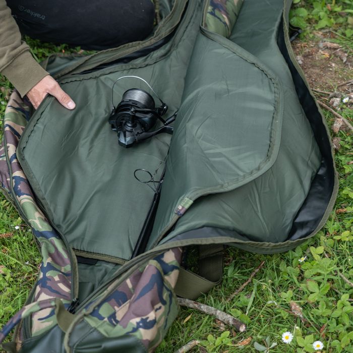 The Advanta 3 rod carp holdall is the prefect item to safely and securely transport and carry your 12ft 2-piece carp rods and reels to and from your chosen fishing location. The Advanta 3 rod holdall features multiple protective zipped leaves inside to ensure your rods and reels do not knock together during transit. The inside also features retention pockets at the bottom of the bag for the rod butts and tip sections to fit into and Velcro retaining straps within the length of the bag to firmly hold all the rods in the correct position. The Advanta 3 rod holdall is made to fit 12ft 2-piece carp rod and will accommodate rods with 50mm but guides easily, the reel pouch has been designed to accommodate the biggest big pit style reels with ease and means all 3 fishing rods can be transported together easily and safely. The Advanta 3 rod holdall features many additional outside pockets and storage areas for things such as bank sticks, storm poles, landing nets and even a brolly pocket is fitted to enable you to carry a shelter or standard brolly if required. A padded shoulder strap and carry handles also feature on the bag to make it easy to carry or lift into and out of a car or on and off the barrow. A nice additional feature on the 3-rod holdall is the inclusion of an external leads pouch to ensure the deals on your rods can be removed to avoid accidental damage to the rod blanks or guides during transit.