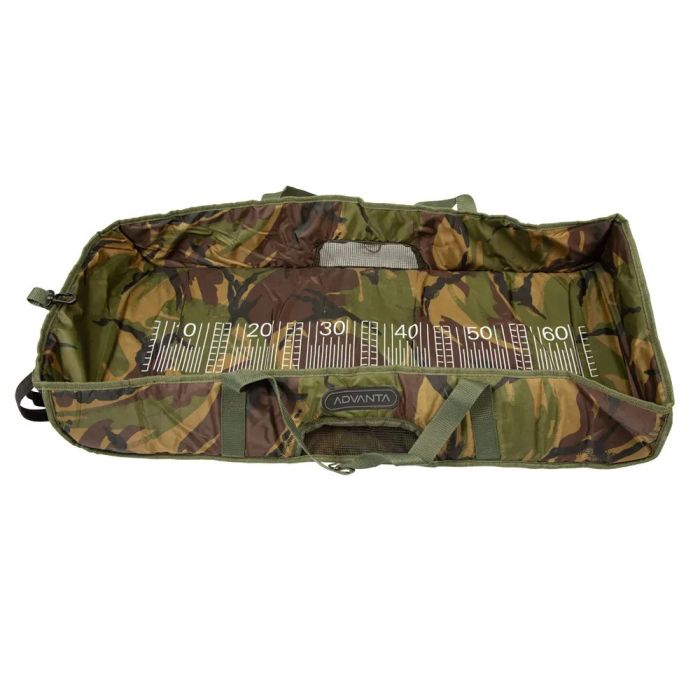 Advanta Camo Perch Weigh Mat, The Advanta Perch and predator weigh mat is a great item of tackle for anyone who fishes for a variety of predatory species such as perch and zander regularly. The mat not only offers protection to your catch once out of the water, but it can also aid with measuring and estimating weight quickly and easily. In recent years the process of measuring catches rather than weighing has become more common place, especially amongst predator anglers and street fisherman and can create a fun way catch smaller fish in competitions. The Advanta predator weight and measure mat features a 60cm internal measure to enable the angler to measure their catch, record it and put it back unharmed quickly and efficiently. The Advanta Predator weigh and measure mat also features long handles with a metal ring to aid with weighing your catch, the sides of the mat feature water drainage holes to ensure any excess water is out before weighing. The Advanta predator weigh and measure mat rolls up into a very compact size and features retention straps and a handy hook to connect it to the outer of rucksacks or other luggage so its easily accessible and wont get your bag wet during the fishing day.