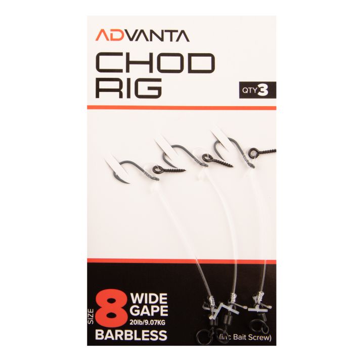 Advanta Chod Fishing Rigs 3pk (With Bait Screws), The Advanta Chod Rigs are made using the finest quality components possible to create a rig that is convenient and easy to use. The Chod rig is an essential rig for all anglers who fish a variety of waters and especially weedy lakes. The Chod rig is the cast anywhere rig you can count on to present a bait even in the thickest weed or cast at showing fish when you are unsure of the lakebed, a true dream rig. The Advanta Chod rigs are made using an ultra-stiff clear filament material, this material will hold its shape well to create that all important curve in the line even when a bait is attached. The Advanta Chod rigs offer a simple pre tied solution to using one of the most in vogue rigs of them all, simply screw a bait onto the bait screw and its ready to fish. The Advanta Chod rigs are tied using ultra sharp Teflon coated hooks Chod hooks that feature a slightly back turned eye to allow the hook to sit at the correct angle. The Advanta Chod rigs are available in barbed and barbless options in the most popular sizes and are supplied in packs of three rigs per pack meaning you can fish identical rigs on all three rods.