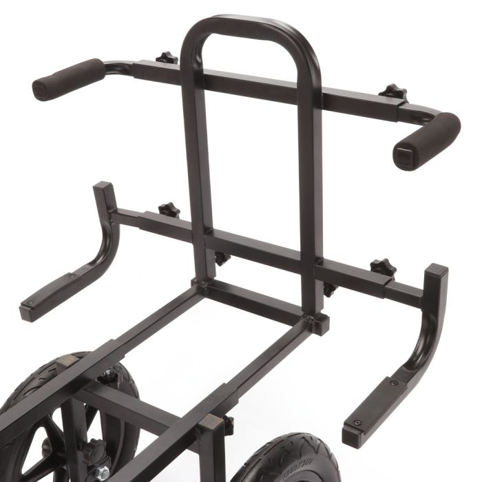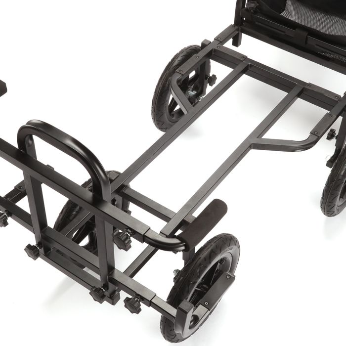 The Advanta match barrow 4 wheel has been specially designed barrow to allow anglers to transport their tackle effectively and easily from their vehicle to their chosen fishing spot with ease. The Advanta match barrow 4 wheel has been developed to carry many different seat boxes on the market and makes light work of pushing the fully loaded barrow due to the use of 4 wheels making this barrow exceptionally strong and stable even on the longest journey across uneven terrain. At the front of the barrow there are 2 adjustable width EVA covered bars to help clamp your seat box into position to stop unwanted movement during transit, this is especially handy on uneven terrain such as rivers and canals where your journey can be much longer than commercial fisheries. The Advanta 4-wheel match barrow also features a handy removable storage bag that cab be fitted to the EVA covered crossbar and handles at the back, this can be used for lighter items such as pole rollers, accessories or clothing and enables the angler to carry all their essentials in one go saving both time and energy when they reach the lake or riverbank. The Advanta match barrow also features puncture proof tyres for peace of mind on long journeys that the tyres won’t let you down. The Advanta match barrow 4 wheel comes apart and breaks down for easy transport and comes supplied with a handy storage bag that can be left in the car to transport the barrow cleanly and easily to and from the vehicle to the garage or house saving any mess and mud from the tyres making your vehicle dirty.
