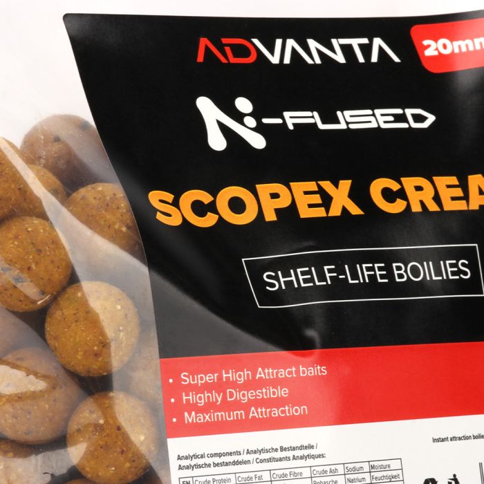 The Advanta N-fused boilie range is made using the highest quality ingredients and flavours to create an all-year-round bait that is both affordable and attractive to fish. The Advanta N-fused bait comprises of a blend of flours, fish extracts and added salt, something carp love and will actively seek out! The Advanta N-Fused boilies are available in three flavours, Monster Fish, Scopex Cream and Super Spice meaning there is a flavour to suit your angling and the time of year you are fishing in the range. The flavour profiles of each of the 3 flavours within the range has been developed to offer a year-round bait solution with high attract flavours and colours to pull fish in from far and wide. The Advanta N-Fused boilie range offer excellent value for money and convenience by offer 2 sizes of bait and 2 sizes of bag to offer a suitable product for all anglers’ requirements. The Advanta N-fused boilies are available in 15 and 20mm in both 2 and 5kg bag sizes. The 5kg bags feature the feed boilies that are perfect for pre-baiting and offer the best value for money for anglers who want to establish a bait on their chosen water.