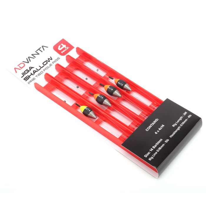 The Range of Advanta Pre tied pole rigs covers all angling situations and species with one simple to use and easy to understand range of products. Each Pack of Advanta Pre tired pole rigs features a full-length rig that is ready to fish and perfectly weighted every time so they can be fished straight out of the packet. Each of the Advanta Pre tied pole rig packs include 4 rigs or varying sizes (excluding Jiga set) so you can target a wide range of fish in various swims and conditions easily and effectively. The Advanta pre tied rigs feature barbless hooks meaning they can be used on all fisheries and high-quality floats and components to make up the rigs, each of the packs contains one yellow tip float and the remaining 3 in the most popular orange colour. Each rig is wound onto a protective pole winder, to attach the rig simply find the loop at the top of the winder and attach that to your pole connector, now simply unwind the rig ready for use, it couldnt be simpler, once finished the rig can be stored back onto the winder for use another day. Simply hook on a bait and get fishing right away.