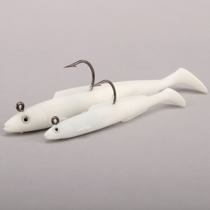 Advanta Super Sandeel Lure - Solid White, The Advanta Super Sandeel lure's are an amazing weighted Sandeel imitation with a lifelike action which is guaranteed to get the attention of all predatory fish. The body material is made of ultra-tough material that withstand multiple captures and fish with teeth nipping the tail. The Advanta Super Sandeel lures are all pre-rigged with an internal lead weight at the head end meaning they cast like a dream and are stable when retrieving them. The hooks used are the highest-grade Mustad saltwater hooks to ensure every fish is well hooked and the hook points remain super sharp even after multiple fish are caught. The 4 inch lures weight 11g and the 6 inch weight 25g meaning you the perfect weights for a wide variety of tactics and venues. The lures are ultra-versatile and can be used from the shore or boat.