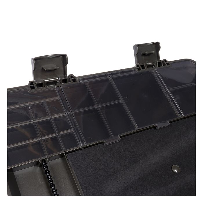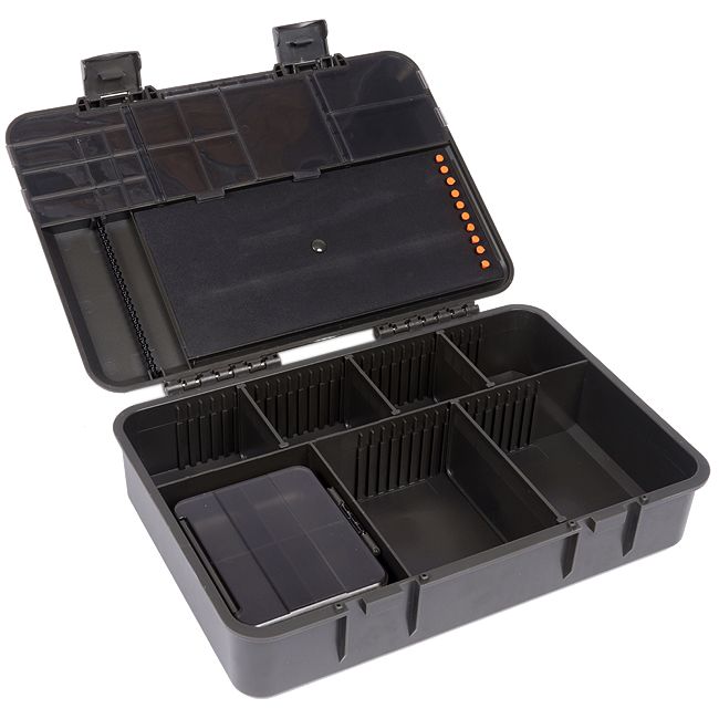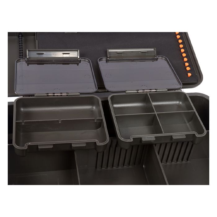 The top compartment of this tackle box features a handy storage area with 17 assorted small, medium and large compartments to store bankside essentials such as hooks, swivels, rig bits and terminal tackle accessories easily. Finished durable clips which keep your tackle safely stored, the Advanta Tackle Box System Large is a great addition to any anglers fishing tackle.