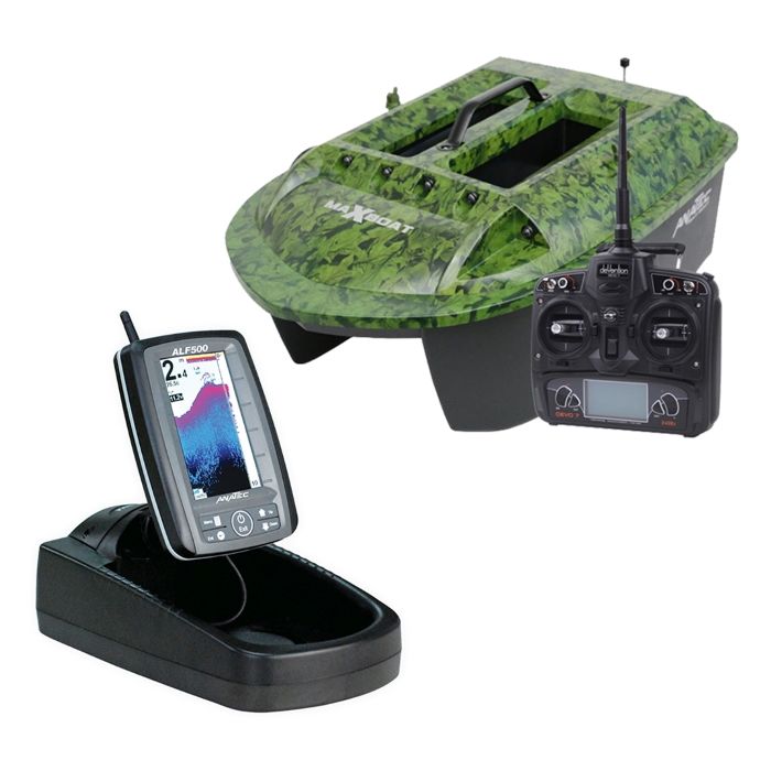 Version compacte du Catamaran, Le MAXBOAT est un bi-moteur equipé de batteries au lithium. Camouflage IVY. Dimensions : 70 X 46 X 33 cm - Poids : 10 Kg - Equipé du sondeur couleur ALF500.