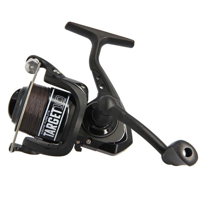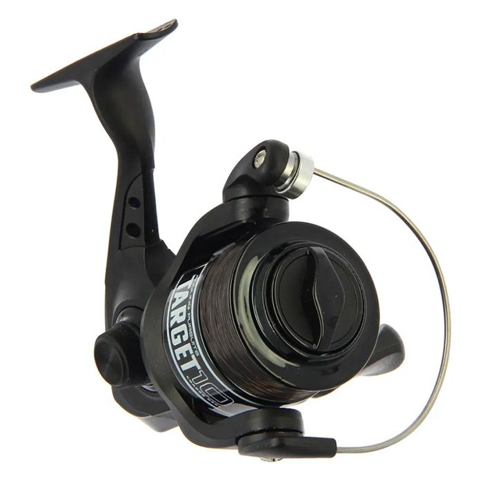 A compact, all‑round mini coarse reel supplied pre‑spooled with 8 lb line—ideal for light coarse fishing and general use. The Target 10 features a smooth front drag, a graphite spool with enlarged capacity, and a right/left interchangeable handle, finished in a clean black design.