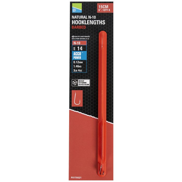 Apportant le design de bas de ligne à un niveau supérieur. Les Montages Prêts sont fabriqués à partir des matériaux de la plus haute qualité, et attachés selon des spécifications précises pour créer des montages qui conviennent à tous les pêcheurs. Le Stick de Montage totalement chargé peut être sorti directement du paquet et placé dans la boîte Mag Store System de la bonne taille. Chaque paquet contient 8 montages attachés à la main qui sont rangés sur le stick de montages, la taille de l’hameçon en plus du diamètre de ligne et la résistance peuvent facilement être identifiés par l’étiquette attachée. Les Hameçons Naturels N-10 sont utilisés sur les montages avec le mono Accu Power pour créer des montages précis et fiables pour utilisation avec beaucoup d’appâts dont les pinkies, les asticots, les vers, et les casters.