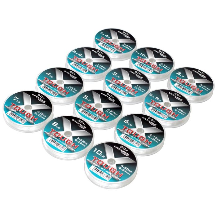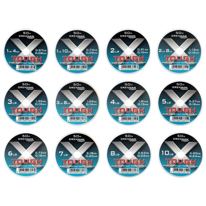 Le mono X Tough est exceptionnellement souple et flexible. Il est aussi très robuste, durable, et résistant à l’abrasion et les dommages de shot, ce qui en fait la matière de bas de ligne et ligne de montage idéale pour le flotteur, feeder, et canne à emmanchement. Des bobines compactes de 50m citent le diamètre correcte et la puissance de nœuds atteignable, plutôt que la puissance linéaire, parce qu’il n’y a pas beaucoup de montages sans nœuds !