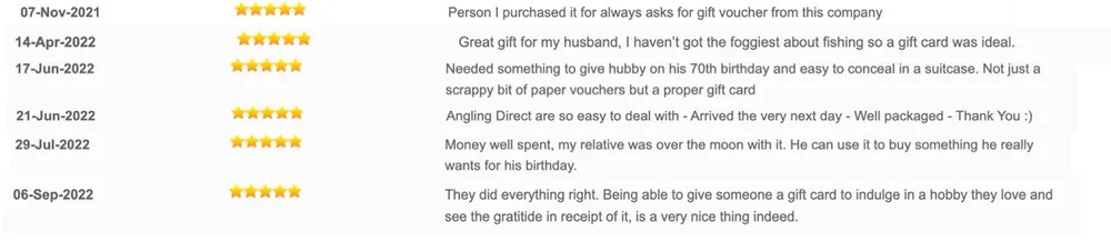 Ne vous contentez pas de nous croire sur parole ! Lisez ci-dessous quelques-uns des commentaires étonnants que nous avons reçus sur les cartes cadeaux Angling Direct !