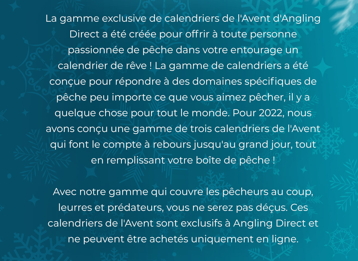 Ces calendriers de l'Avent sont une exclusivité d'Angling Direct et ne peuvent être achetés que dans nos magasins et en ligne.