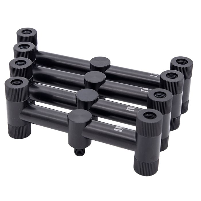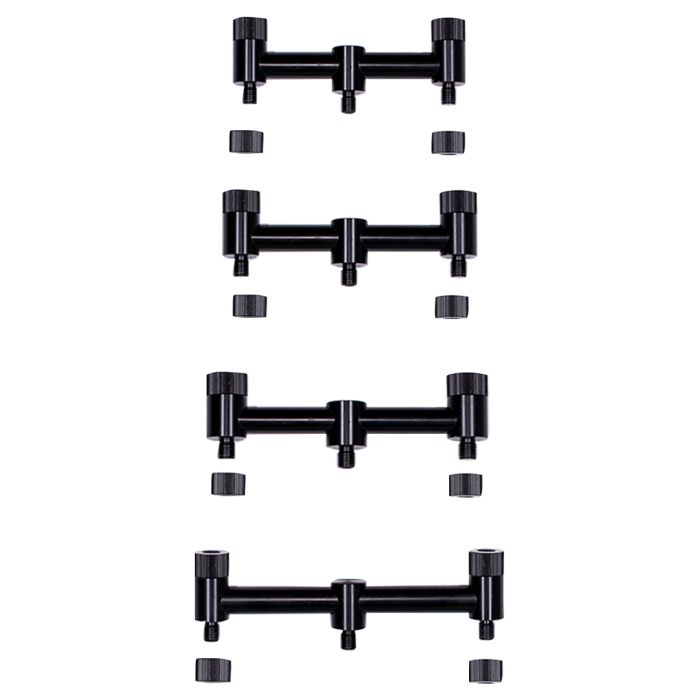 Il y a deux modèles de Buzz Bars Stanz, une version trois cannes et une version deux cannes, avec deux variations de largeur sur chaque modèle. Les deux versions sont fabriquées à partir d’aluminium 16/20mm haut calibre puissant et léger, et ont une finition noire anodisée de qualité supérieure. Le design sur les deux modèles incorpore des fils convertisseurs poste de but sur le dessous et les cols de verrouillage pour l’alignement des alarmes et repose-talon. Ils peuvent aussi être utilisés avec une pique de pêche simple ou en conjonction avec les Sticks Split Stanz pour atteindre une mise en place à double, triple, ou simple bar de base ! Autrement, vous pouvez enlever les couvertures de capuchon à vis convertisseurs poste de but et utiliser en mise en place poste de but ou stick simple lorsque vous utilisez la fixation de vis centrale.