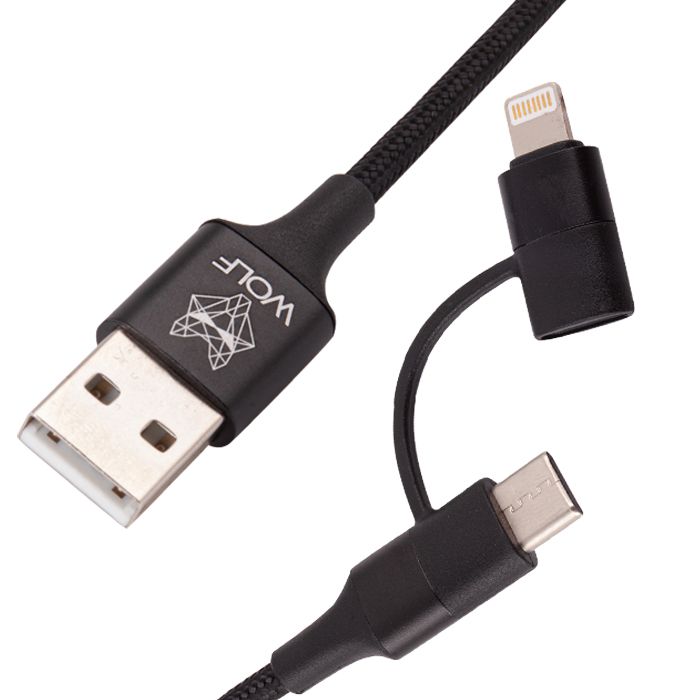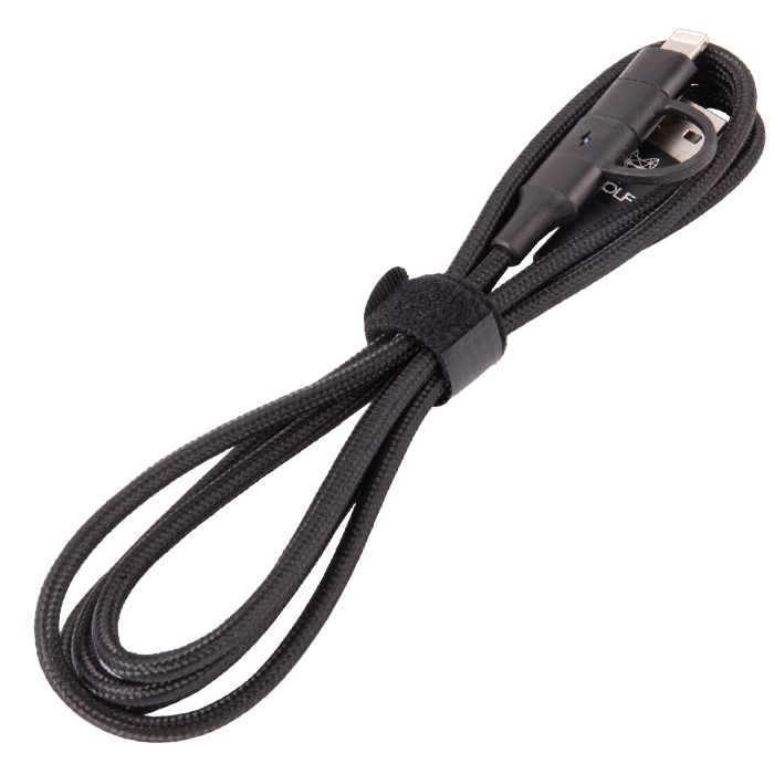 Le câble de charge Wolf 2 in 1 est un câble de charge pratique pour tous les attributs Wolf, mais aussi pour les i-Phones et Samsung ou d'autres appareils. Équipé de voyants lumineux LED, vous pouvez donc facilement voir s'il est toujours en charge ou complètement chargé avec une couleur verte. Convient à la synchronisation des données et à la charge. Le boîtier du câble est en alliage d'aluminium avec un câble tressé en nylon résistant. La longueur du câble est de 1,2 mètres. Le câble est compatible avec Samsung Android type-c & I-phone Apple et autres appareils. Ce câble est un essentiel pour charger vos produits Wolf et autres appareils!