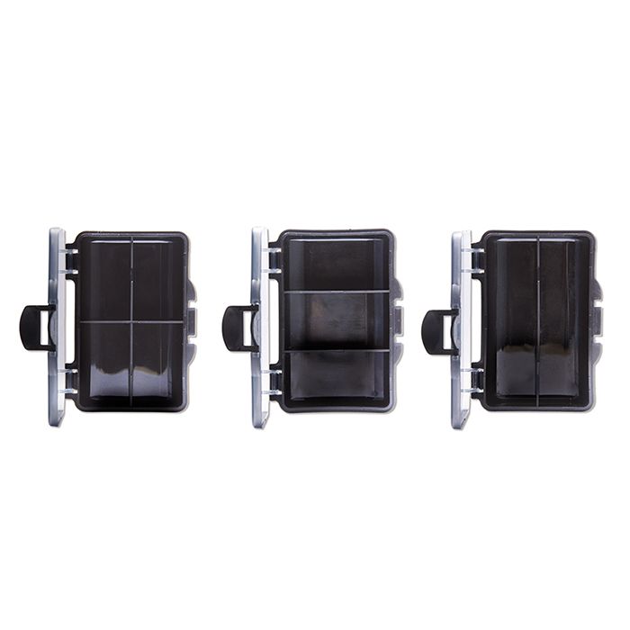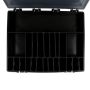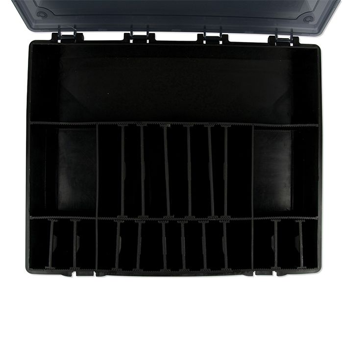 Boîte à pêche pour ranger tous vos accessoires, tresses, matériel de montage et se compose de : x1 - grande boîte à pêche principale avec séparations réglables. x1 - boîte de rangement des montages avec inserts en mousse et broches x1. x1 - petite boîte à 2 sections. x2 - petite boîte à 3 sections. x2 - petite boîte à 4 sections. Couvercle teinté pour protéger vos accessoires du soleil.