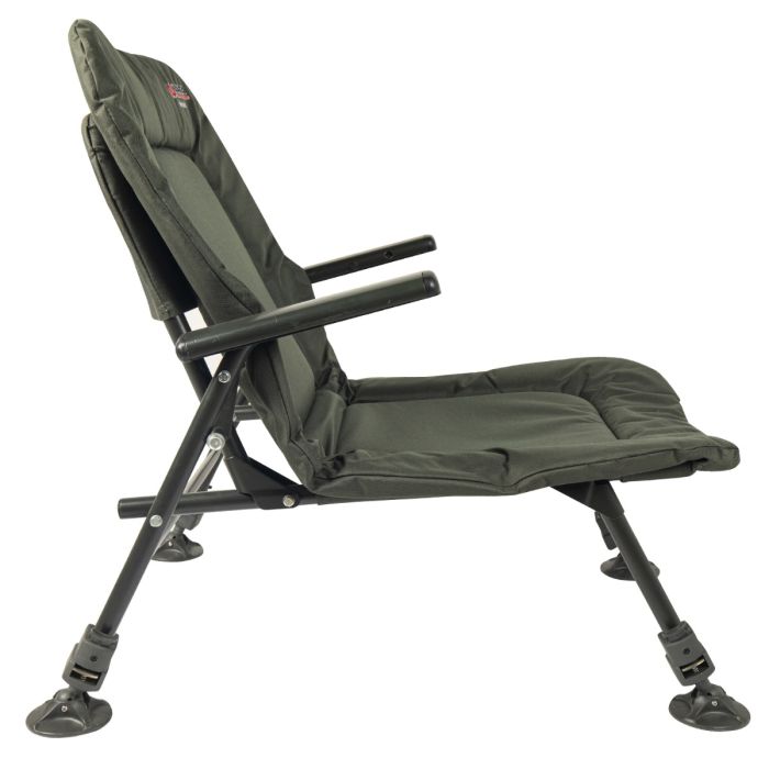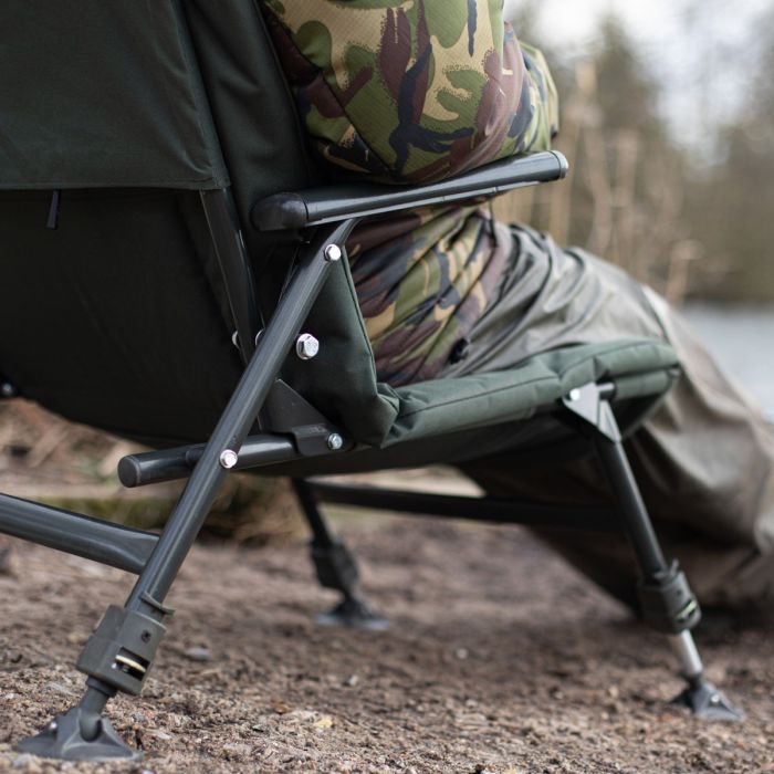 La première chose que vous remarquerez à propos de cette chaise est son profil compact et bas. En effet, ce modèle Endurance a des pieds plus courts que la chaise de pêche standard. Avec ce profil bas, c'est la chaise parfaite pour une utilisation à l'intérieur d'un biwy ou d'un brolly, parce qu’elle offre plus de place pour la tête que les chaises traditionnelles. Que vous soyez un pêcheur plus grand et que vous vous débattiez pour obtenir de l'espace ou que vous soyez quelqu'un qui préfère une installation à profil bas, cela vous permet de vous asseoir en hauteur tout en profitant d'une vue panoramique de l’eau. De plus, cette chaise est également équipée de pieds individuellement réglables en hauteur. Cela vous permet de tenir compte de toute cambrure abrupte ou autrement défavorable sur la berge, et vous permet de vous asseoir à plat sur n'importe quel terrain. C’est grâce au fait que la chaise Endurance Basse est équipée de pieds à boue pivotants. Il s'agit de grands pieds plats qui sont fixés aux pieds par une charnière à rotule, permettant aux pieds de pivoter en fonction du terrain afin d'avoir une base solide sur laquelle vous pouvez vous asseoir toute la journée.