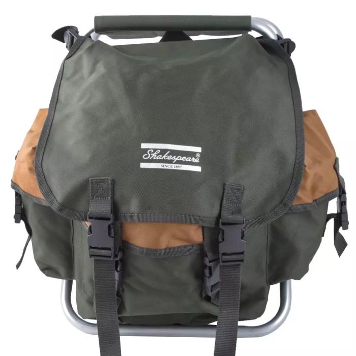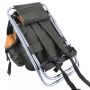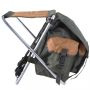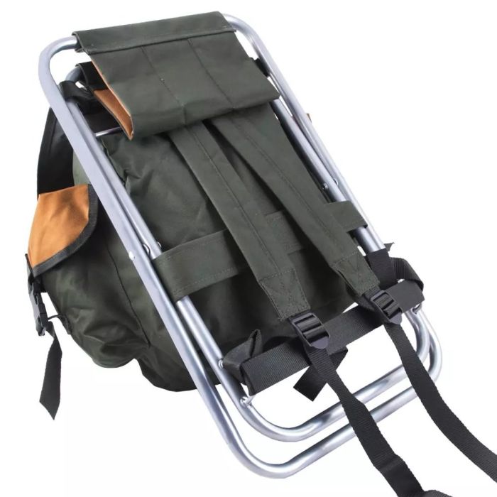 Tabouret pliant léger avec siège en toile et sac à dos intégré, bretelles réglables et rembourrées, compartiment principal sécurisé par un cordon de serrage et des boucles à dégagement rapide.