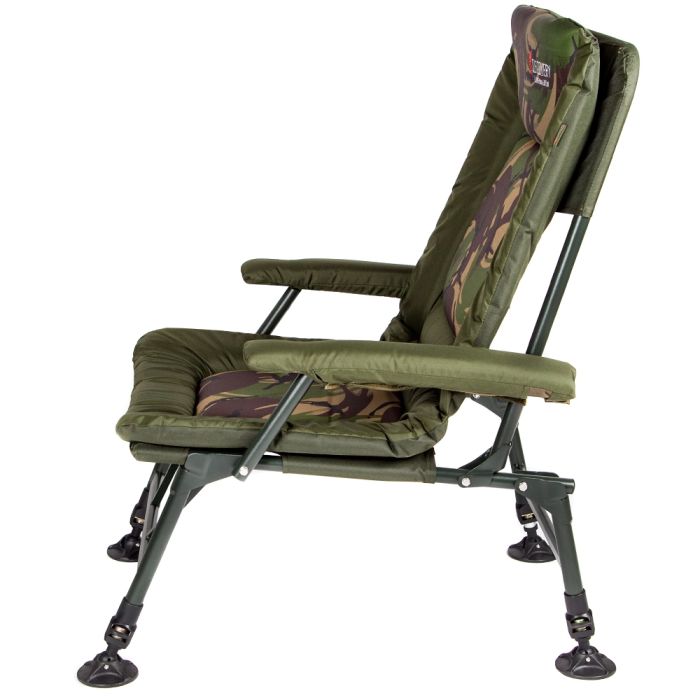 Des accoudoirs robustes, recouverts d’un tissu au toucher doux, vous donne une touche de luxe durable. Le siège lui-même est facile à régler, et un mécanisme de verrouillage intégral assure que, une fois que vous êtes en position, vous savez que la chaise tiendra, peu importe à quel point vous êtes actif lors de votre session. Le système de pied long est aussi totalement réglable et verrouillant, vous donnant la flexibilité de vous adapter à tout terrain de rive, tout en assurant que vous avez une base complètement stable, avec des pieds anti-boue pivotants qui se plient plats et peuvent convenir à toute surface de rive.
