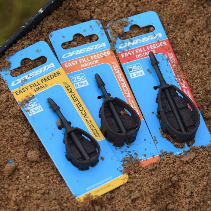 Les feeders Accelerate Easy Fill Distance ont été, comme leur nom l’indique, conçus pour les pêches à longue distance. La conception allongée de leur corps et le tube rallongé leur confèrent un centre de gravité plus bas, optimisant ainsi les possibilités de lancer loin. Leur conception en métal a une forme aérodynamique et leur revêtement est aussi discret. Alors que le fond du feeder est complètement fermé, sa conception bien pensée fait que les petites fentes qui se trouvent sur le côté permettent à l’amorce et appâts de se libérer facilement, une fois le feeder sur le fond. Le tube amovible est doté d’un petit manchon en caoutchouc compact situé à son extrémité. Une petite fente située sur la partie inférieure permet également de changer rapidement le feeder sans avoir à refaire son montage.