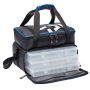 Two-layer case offers front access to three medium tackle boxes via zip round flap; Slim zippered inside pocket; The upper section is padded; Velcro adjustable partition; Slim zippered inside pocket on the lid; Reinforced base; Adjustable padded should strap; Velcro closure carry handles; Dimensions; Base: 38cm x 24cm x 18cm; Top: 38cm x 23cm x 9cm