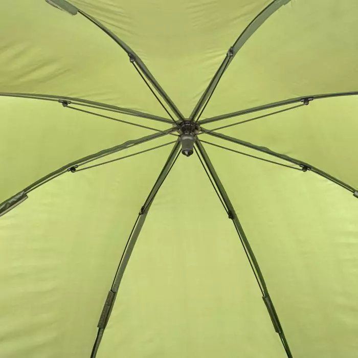 The very functional oval brolly ; Top of the class ; When it comes to fast erection; Apart from the small pack size ; And the fast erection; Offers the possibility to place the bedchair ; Further in the back; Resulting in more space ; And increased protection against the elements; 210D nylon with silicon coating; D-rings for pegs; Pegs and 2 storm poles included; Carrying bag included; Dimensions: 210x150x140cm