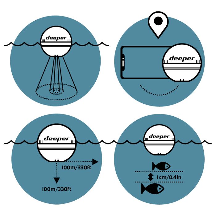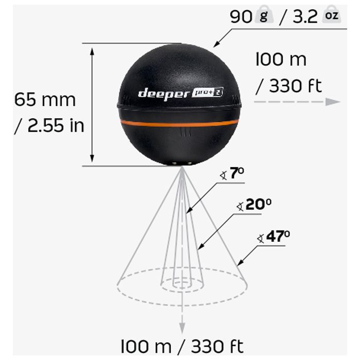 Le Deeper PRO+2 est plus performant que jamais avec 3 fréquences de faisceau, des visuels plus nets et plus clairs, des performances GPS accrues, une batterie plus longue jusqu'à 9 heures (selon l'utilisation), et une profondeur de balayage jusqu'à 100 m.