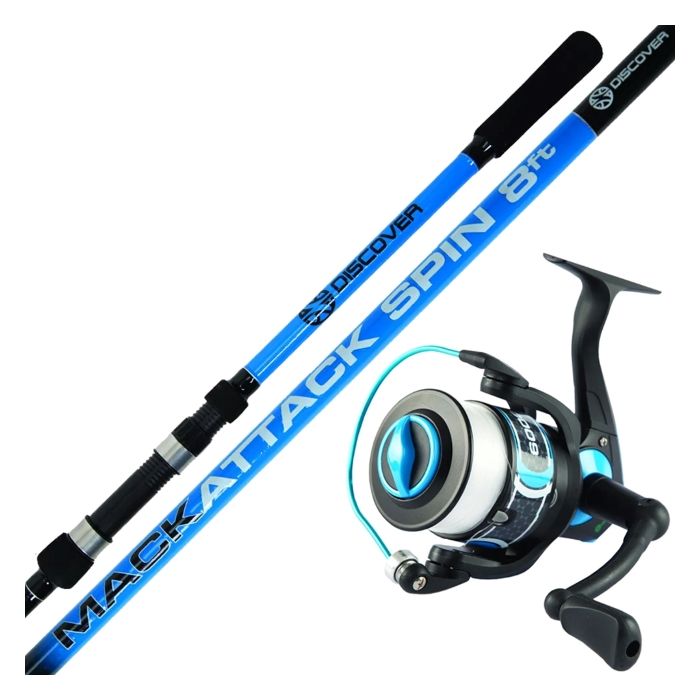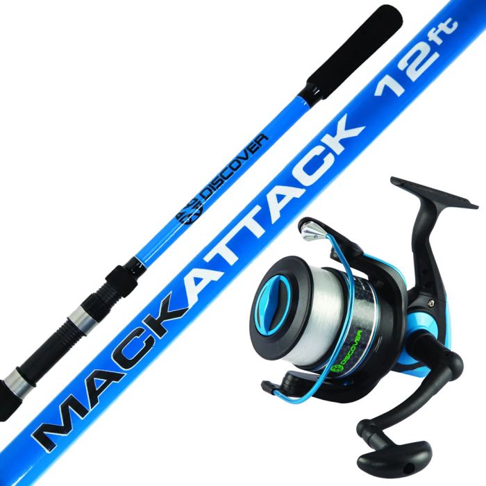 Discover Mack Attack Fishing Rod & Reel Combo, The Discover range of combo rod and reel outfits offer superb value for money and an easy entry point into the world of angling. Everything you need from the rod, reel and line is provided meaning you simply need to tie on the relevant terminal tackle, and you are fishing in minutes. The Discover Mack Attack combos are designed to attract new and beginner anglers to take up fishing and offer an easy access point into the world of fishing. Mackerel fishing is one of the most enjoyable types of fishing, especially if you are on holiday and enjoying the coastline. All the Mack attack combos feature 2-piece rods with EVA grips and an appropriately sized reel for the rod, each reel is loaded with the correct line to ensure your setup is suitable and safe when fishing. The Mack Attack combos are available in three length and strength options to cover the most popular styles of angling and types of venue. The 8ft model would be great for casting lures from rocks or the beach. The 10 and 12ft models would be more suitable for beaches, piers and harbor walls and fishing with feathers, this involves multiple hook rigs that imitate a shoal of baitfish when cast out and retrieved, you can catch multiple fish each cast. great fun!