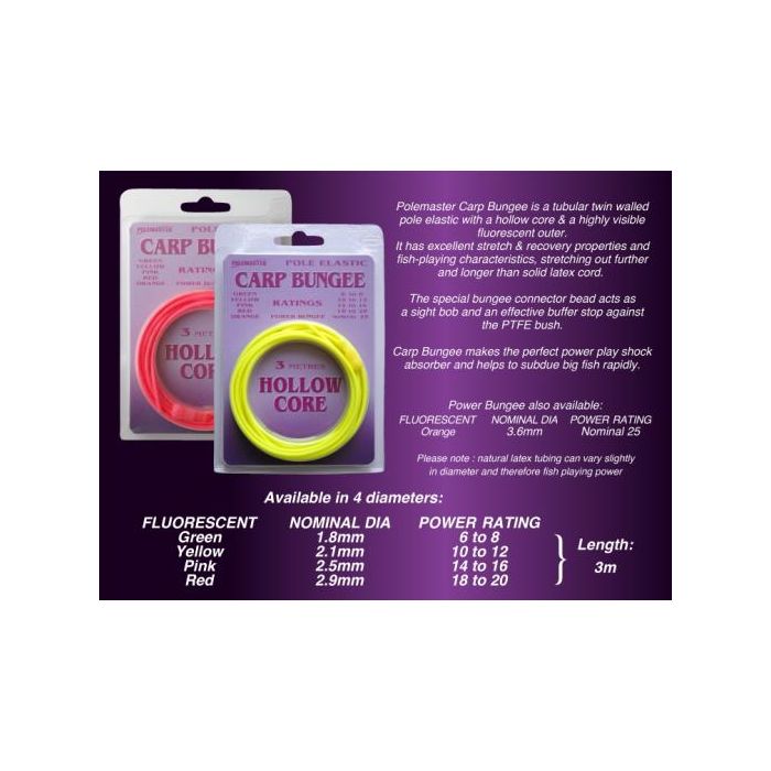 L'Élastique Bungee Drennan Carp existe en 4 tailles et est un élastique tubulaire à double paroi avec un noyau creux et un extérieur fluorescent très visible. Il possède d'excellentes caractéristiques d'étirement et de récupération et constitue l'amortisseur parfait pour maîtriser rapidement les gros poissons. Des instructions complètes sont incluses dans chaque paquet. Tailles : Vert : 6 8 Jaune : 10 12 Rose : 14 16 Rouge : 18 20