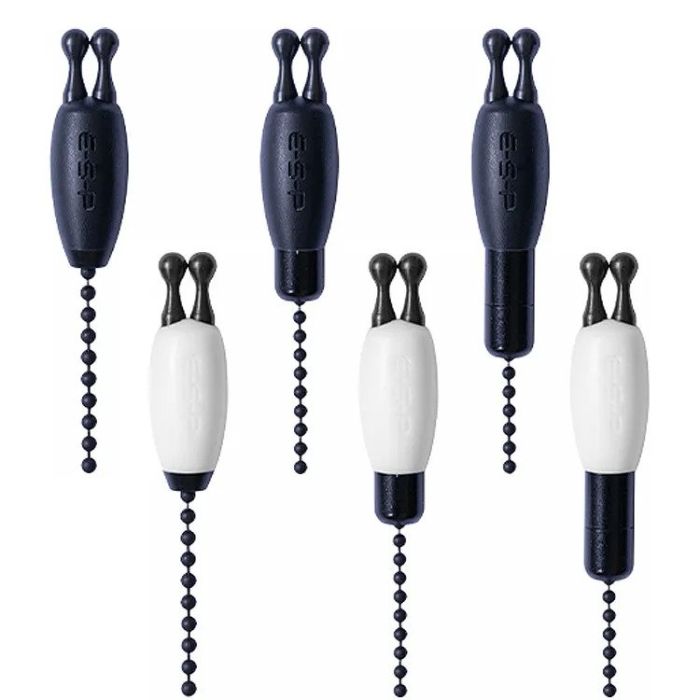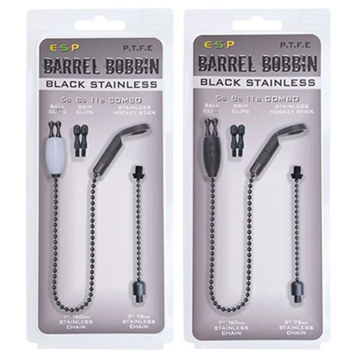 The two stainless ball chains have a unique feature where we have used a machined acetyl connector at one end and a 3g black stainless connector at the other. This allows the chain to be simply reversed to add weight to the bobbin when required. Also adding the 3g stainless add-on weight integrated into the hockey stick increases the weight further and means that the PTFE bobbin can be used at weights of 5g, 8g or 11g. This makes for a highly versatile set up suitable for everything from slack line fishing where a light bobbin is required to tight line fishing at range with the weight of the bobbin increased to the maximum. The interchangeable line clips simply allow the bobbin to be fished running on the line with the ball clips or gripping the line 'Elstow style' with the grip clips. The 3" ball chain is best suited to this setup, with the bobbin fished on a short drop near the bite alarm.