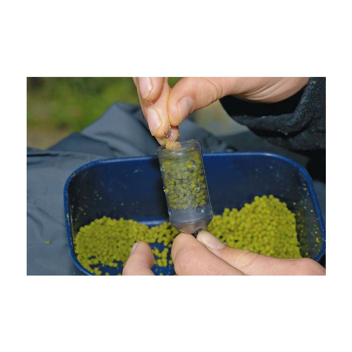 Pour utiliser, préparez votre appât et bas de ligne de la manière habituelle - comme vous le ferez avec un feeder méthode standard. Pendant que vous faites cela, trempez vos pellets choisis dans de l’eau pendant quelques minutes, les permettant d’adoucir assez pour que quand vous les compressez ils se collent ensemble sans perdre leur forme. Remplissez le Feeder Middy Shotgun avec le mélange de pellets, poussant votre appât dans le feeder une fois qu’il est un peu plus d’à moitié rempli. Remplissez le feeder complètement, mettant autant de mélange dedans que vous voulez. Le plus d’appât vous mettez dedans, plus il prendra de temps pour que le feeder relâche, et l’inverse est vrai aussi - un mélange moins serré se disperse plus rapidement. Les deux méthodes fournissent des résultats fantastiques et le choix de celle à utiliser dépend simplement des conditions à la rive et l’activité des poissons.