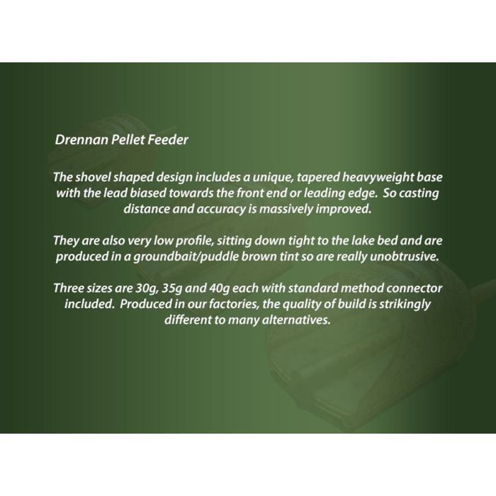 Le design en forme de pelle contient une base unique et effilée de poids lourd avec un plomb orienté vers l'extrémité avant ou le bord d'attaque. Ainsi, la distance et la précision du lancer sont massivement améliorées. Ils sont également très discrets, se calant sur le fond du lac et sont produits dans une teinte marron d'amorce/de flaque d'eau, ce qui les rend très discrets. Disponibles en 3 tailles 30g, 35g ou 40g avec connecteur standard inclus.