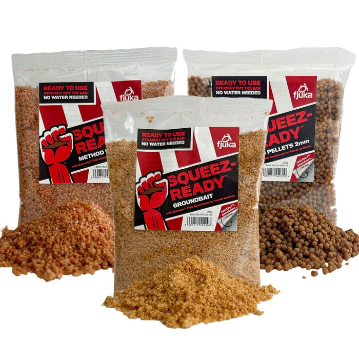 Gamme d'amorce prête à l'emploi directement sorti du sac de Fjuka Squeez-Ready, pas besoin d'eau. Il est désormais impossible pour les pêcheurs de se tromper dans leurs mélanges, surtout dans le vaste marché des distributeurs Method. Ouvrez Squeez-Ready™ et vous attrapez des poissons en quelques minutes, le produit étant riche en accélérant pour poissons Sensate™ pour un temps de morsure bien plus rapide. Disponible en pellets Method de 2 mm, mélange Method (amorce Method) et amorce (amorce polyvalente).