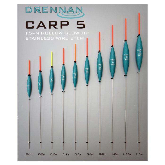 Le Flotteur Carpe 5 est une addition valable à la famille de flotteurs de canne Drennan Carp. Son corps mince aide à la détection de touches et offre peu de résistance tandis que la tige en fil 0.6mm maintient le flotteur très stable. Une Pointe Glow creuse 1.5mm fonctionne bien avec une multitude d’appâts, dont les asticots, casters, pellets, maïs, et vers. La pointe est aussi sécurisée sur le corps et renforcée avec un robinet de renforcement. Un œillet ressort en acier inoxydable noir ajoute plus de durabilité et est double enroulé pour empêcher la ligne de se coincer. Comme avec tous les flotteurs cannes Drennan le Carp 5 est fabriqué et assemblé à la main dans nos propres usines et est fini avec une peinture acrylique spéciale qui le rend super robuste et difficile à rayer. Ce flotteur peut fonctionner tout aussi bien en eaux ouvertes, marges peu profondes, et nages îlots. Il est aussi disponible en pas moins de 10 tailles, de 0.1g jusqu’à 1.5g. Le Carp 5 est un design extrêmement réglable qui couvre une variété de profondeurs, appâts, méthodes, et espèces.