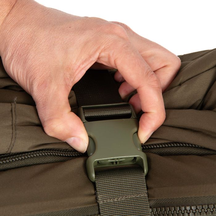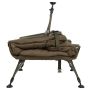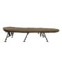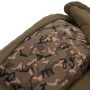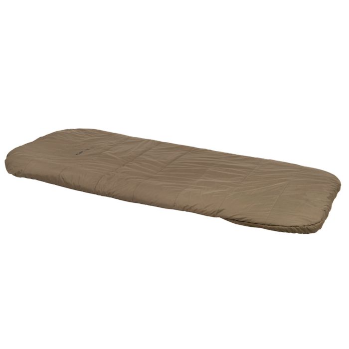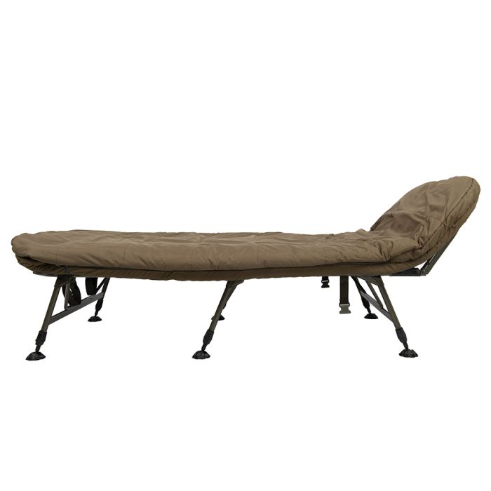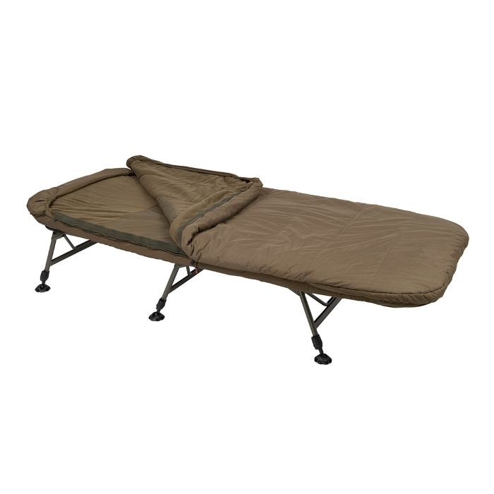 Fox Flatliner X All Season System, A complete “all in one” 3 and 5 season, bed and bag sleep system Featuring a Flatliner X 6-Leg bed with zipped in Ventec All Season Sleeping Bag. New and improved design that helps to make it our most comfortable bedchair ever Completely flat frame for maximum comfort. Large double hinges are designed to allow elastic to run through them ensuring consistent firmness in the whole mattress. Hinges sized to allow bed to be packed away with All Season sleeping bag still attached to create a compact, parallel, tidy pack down shape. Rubber overmoulded hinge cover prevents damage to the hinge or surface the bed is placed on. Also ensures the bed stands up straight when packed up Full “In Frame” Lumbar support – The head, middle and foot sections all benefit from a full “in frame” support design creating consistent firmness throughout the whole mattress. New one touch spring-loaded leg mechanism, for easy leg height adjustment. Dual layer 50mm mattress that is constructed from a high density foam base and soft hollow fill upper allowing for a soft touch but firm construction. Mattress is covered with a camo peach skin fabric perimeter and head area with a comfy fleece main section. The mattress outer perimeter uses a firmer foam to reduce compression on the bed frame.