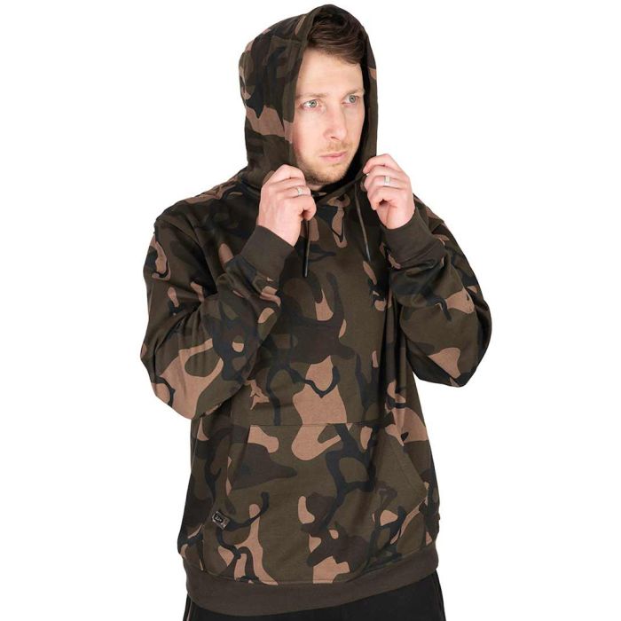 Unique Fox camo pullover hoodie. Drawcord hood, ribbed cuffs and hem. Front pouch pocket.