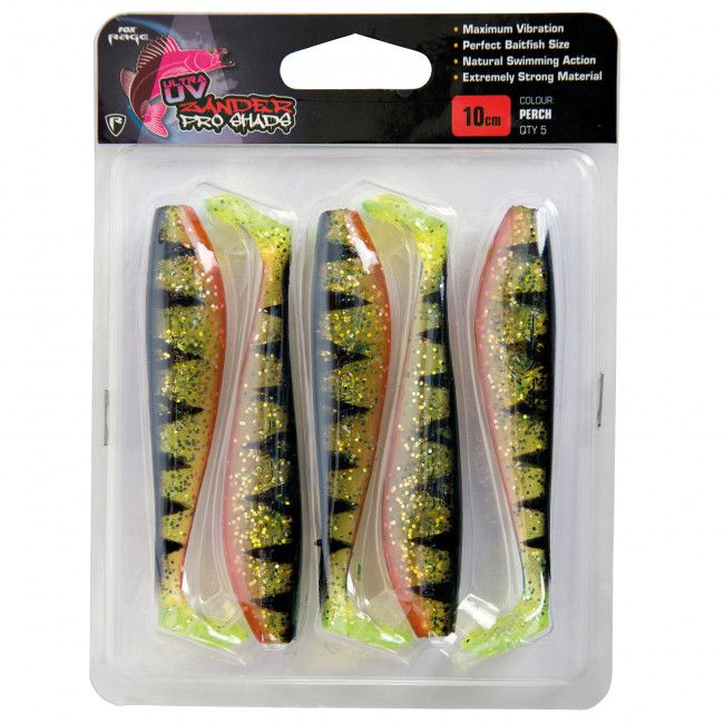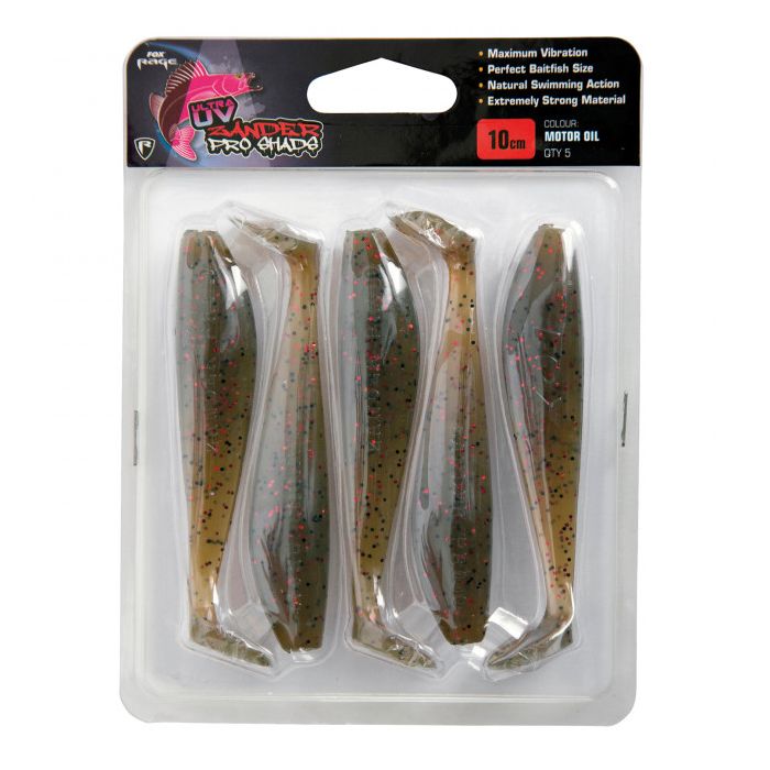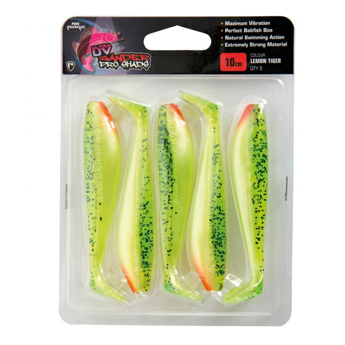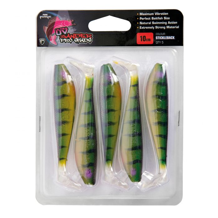 New Fox Rage Zander Pro Shad ; Ultra UV multi-pack options; Brilliant Ultra UV colours; Established fish-catching pattern; Available in four popular colours; Ultra UV Motor Oil; Ultra UV Lemon Tiger; Ultra UV Perch; Ultra UV Stickleback; 10cm in length; 5 supplied per pack