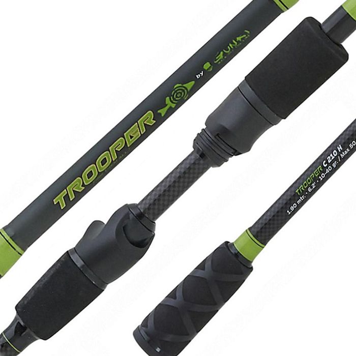 Deux excellents rapport qualité / prix pour les cannes de coulée d'appât d'argent conçues pour la pêche à leur leurre. Coupez le siège de bobine pour un contact direct avec la détection vide et une meilleure morsure. L'action est la mieux décrite comme une régulière rapide polyvalente qui se prête à une gamme de techniques de leurres doux à branches. Le Trooper C-190MH est parfait pour les grands et moyen-types, tandis que le Trooper C-210H a plus de puissance de gérer des appâts plus gros. M1 Blans de carbone et bagues SIC. Équipe ces cannes avec un Trooper BC 200 moulinet pour un combo équilibré qui est une joie de pêcher! P>