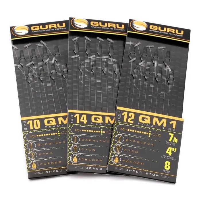 The QM1 Speed Stop Ready Rigs are available in 4" and 15" lengths, which cover a wide array of different fishing situations and hookbait options. The 4" Guru Ready Rigs comes pre-tied on our reliable rig boards and are the perfect method feeder rig. The 15" QM1 Ready Rigs come pre-tied on our easy-to-use hooklength spools, which fit perfectly into the Guru Rig Boxes, improving organisation and efficiency, and are the perfect open end feeder rig or pellet waggler rig.