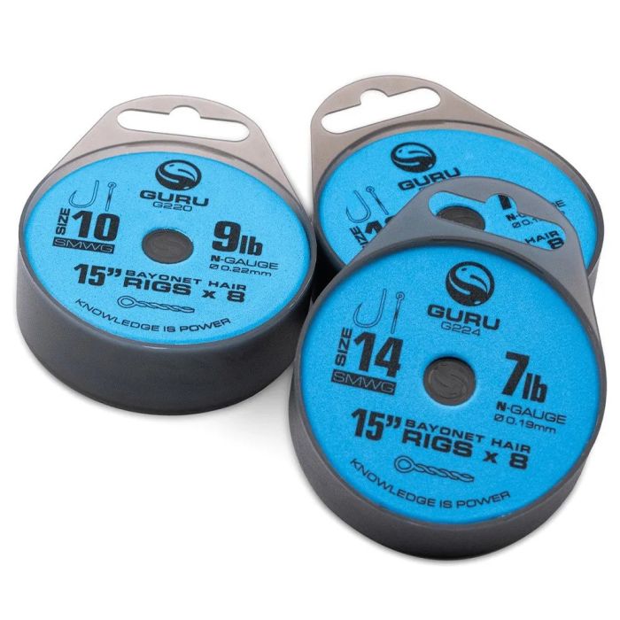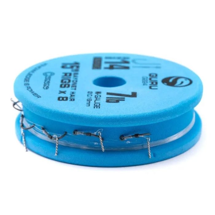 The Guru Super MWG 15 Inch Bayonet Hair Rigs feature an optimum hair length which has been purposely developed to perfectly present most popular hookbaits. Featuring one of the most popular of Guru Fishing Hooks and finishing off the hair is a Guru Bayonet in the end which can be pushed into your intended hookbait. There is also a tiny piece of 0.3mm micro silicone on the shank of the hook which is there to keep the hookbait in place and make sure the rig is working perfectly.