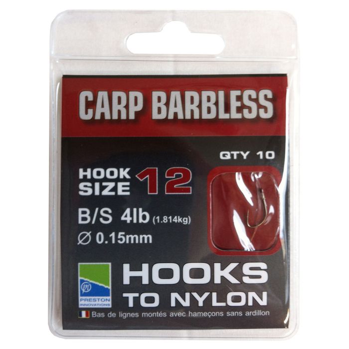 Les hameçons sans ardillon carpe sur nylon sont disponibles en versions Standard, Strong et Xtra Strong pour répondre aux exigences du pêcheur de carpe commercial moderne. Super tranchants, ils sont disponibles dans une gamme de tailles liées à des résistances populaires de ligne mono de haute qualité. Ils conviennent à une grande variété d'appâts et sont parfaits pour toutes les situations de pêche.