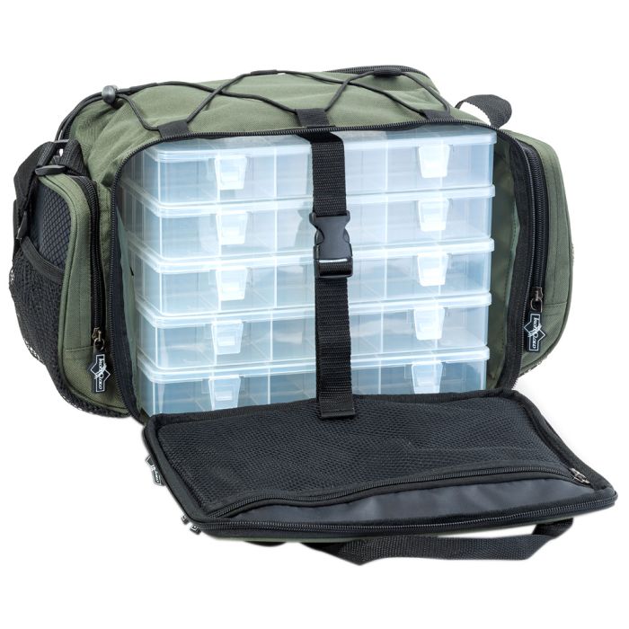 With five boxes, a lot of tackle can be accommodated here. Nevertheless, this bag can still be transported comfortably. Very practical due to additional outer and mesh pockets