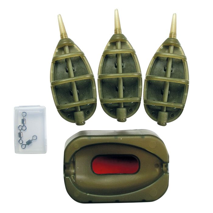 Le set se compose de 3 mangeoires à cage plate sans plomb, de tailles 20, 25 et 30g, avec un moule de forme de mangeoire de méthode et 3 émerillons.