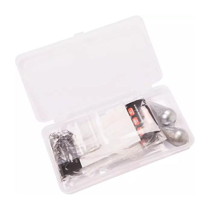 En plus de la canne à pêche et du moulinet, le kit est livré avec un petit coffre à pêche, rempli de matériel pouvant être utilisé pour la pêche en mer. Outre les deux plombs, 3 oz, le kit fournit également un montage parfait en fournissant cinq émerillons de taille 1 et cinq émerillons à agrafe de taille unique. Le kit de pêche vous aide à attraper le maquereau ou goberge en utilisant les deux montages équipés. Tout cela est livré dans une petite boîte à pêche en plastique que vous pouvez utiliser pour stocker et transporter les objets.