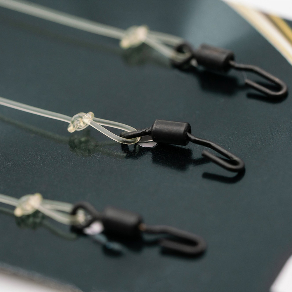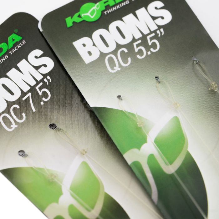 Le montage Spinner est une des présentations pour attraper des carpes les plus populaires et efficaces qui existe actuellement, mais les attacher à partir du début peut prendre beaucoup de temps, et être intimidant si vous ne l’avez jamais tenté avant. Les Booms QC sont attachés sur des fluorocarbones Boom 25lbs de 7.5 ou 5.5 pouces, avec une boucle à un bout, et un émerillon QC à l’autre, et ils rendent incroyablement facile la mise en place d’un montage Spinner. Il suffit simplement d’ouvrir l’émerillon QC avec un outil de sertissage, juste assez pour enfiler sur votre hameçon, puis le pincer pour le ferme. Glissez dessus un Kicker pour sécuriser l’hameçon en place, puis ajoutez simplement un émerillon Micro Rig et Perle d’Hameçon pour compléter le montage. Un bout de mastic Dark Matter peut être moulé autour du nœud boucle si nécessaire pour équilibrer votre bas de ligne.