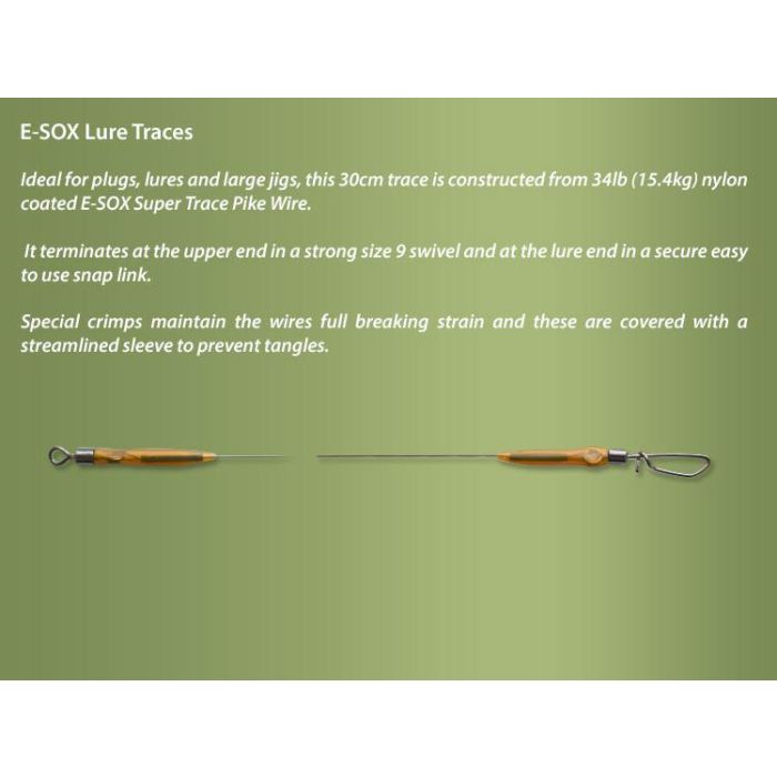 Idéale pour les plugs, les leurres, et les grands jigs, cette trace est fabriquée à partir d’un fil Super Trace Brochet revêtu de nylon. Il y a un émerillon puissant taille 9 sur le côté supérieur et sur le côté leurre il y a un snap sécurisé facile à utiliser. Des sertissages spéciaux maintiennent la résistance totale du fil et ils sont recouverts d’une gaine affinée pour empêcher les emmêlements.