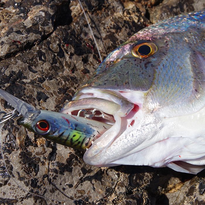 Un leurre compact super renforcé, capable de cibler les gros poissons comme les vivaneaux, les thons, les bonitos, les mérous, les barracudas, les poissons bleus, etc. On peut le laisser atteindre le fond ou le pêcher avec une récupération immédiate, pour couvrir tous les niveaux de la mer. Parfait pour une utilisation inshore et offshore ainsi que pour la pêche à la traîne. Le Gravity Runner 100 possède une action forte et très stable, défiant les conditions météorologiques et les conditions de l'eau.
