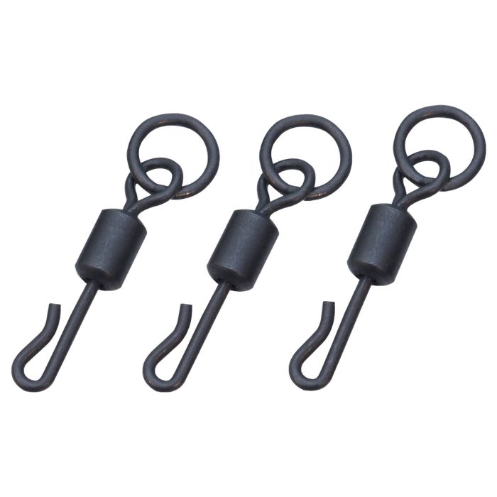 Parfait pour le montage Ronnie très efficace, la légère ouverture dans le crochet permet de fixer facilement l'hameçon et la rotation douce permet un mouvement à 360 degrés. Les deux tailles différentes peuvent être adaptées à des hameçons et des appâts de différentes tailles pour créer une présentation parfaitement équilibrée. Ces émerillons peuvent également être utilisés sur un montage hélicoptère où le crochet permet un changement rapide d'un bas de ligne bouclé et le grand anneau assure une mise en place sûre. Finition noir mat. Disponible en tailles 9 et 11.