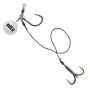Système de jig vertical avec une balle de plomb clipsable avec des fossettes de balle de golf (pour réduire la traînée). Toutes les pièces (émerillon, anneau fendu, anneau plein, tresse, hameçon simple et triple) sont résistantes. Prêt à l'emploi. Le choix du montage et/ou du poids dépend du courant, de la profondeur de l'eau et/ou de la taille du poisson-appât. Des boules libres, de différents poids, sont disponibles.