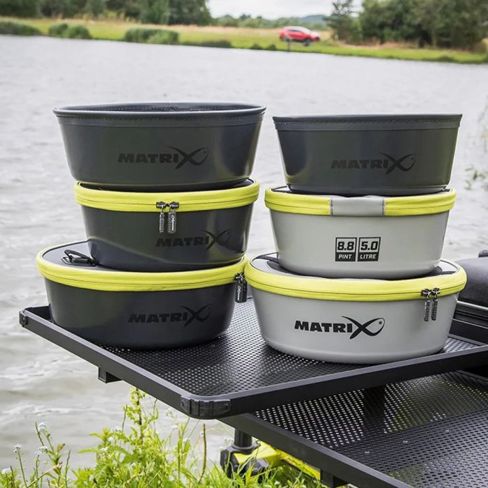 Matrix Moulded EVA Bowls, Ideal for mixing groundbait or soaking pellets. Unique moulded EVA base with tapered walls to allow stacking. Large, rounded corners to stop bait getting stuck, constructed from 1mm EVA. Available in 7.5L & 5.0L capacities.