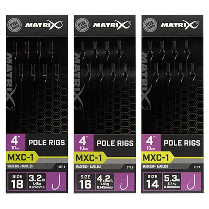 Matrix MXC-1 Barbless 10cm Fishing Pole Rigs, Looking to do some serious fishing? Then you need the Matrix MXC-1 Barbless 10cm Fishing Pole Rigs. These rigs are perfect for fishing in commercial fisheries, and they come with premium Matrix components. The MXC-1 hook is ultra sharp and coated with PTFE, making it perfect for catching fish. The power micron mono is also perfect for bait fishing, and the rigs are balanced so that they can be used with pellets, corn, or meat. With these rigs, you'll be sure to catch a lot of fish!