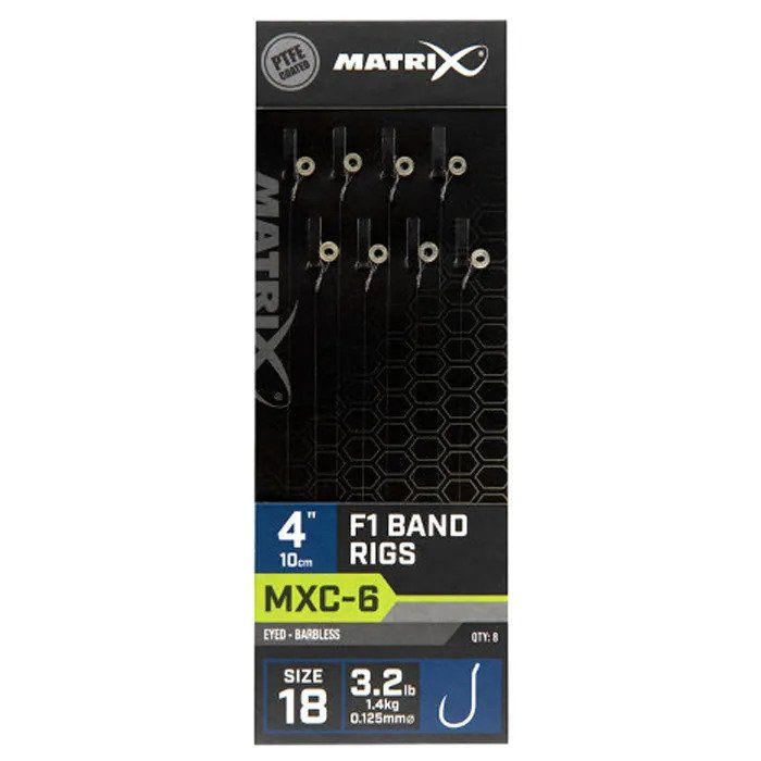 Matrix MXC-6 Barbless 10cm F1 Band Fishing Rigs, Looking to target F1s and smaller commercial carp? Then you need the Matrix MXC-6 Barbless 10cm F1 Band Fishing Rigs! These pre-tied hooklengths are perfect for pole fishing, and feature a lighter gauge MXC-6 PTFE coated hook pattern combined with our best selling power micron monofilament. Each hook has a small bait band mounted on the hair, allowing you to band on everything from pellets and wafters to casters. So why wait? Get your hands on the Matrix MXC-6 Barbless 10cm F1 Band Fishing Rigs today, and start reaping the rewards tomorrow!