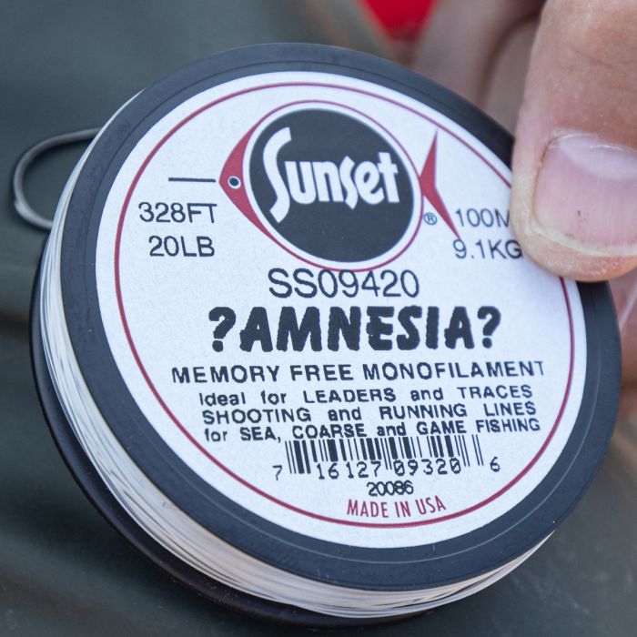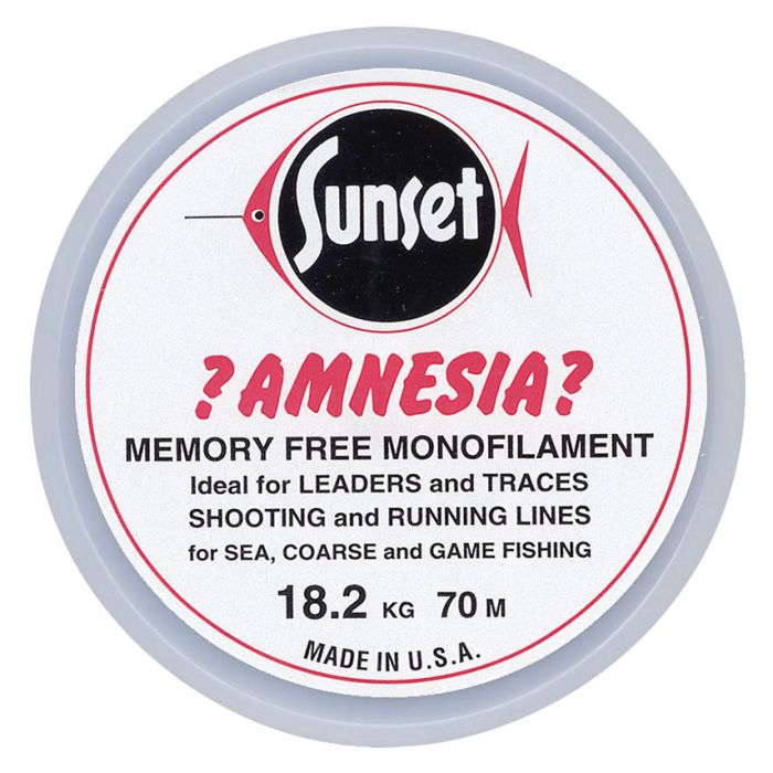 Amnesia a gagné le consensus d’être la meilleure ligne de shooting disponible pour soutenir des cônes de shooting. Dans un procédé exclusif développé par Sunset, le filament solide Amnesia est fabriqué sans mémoire, la tendance d’un filament de retourner à sa position originale rend un monofilament moins idéal pour une ligne shooting. Amnesia coule du moulinet au début de la journée comme tout monofilament, dans des enroulements serrés. Pour préparer l’utilisation, Amnesia a un étirement d’environ 10 pourcent. Pour le reste de la journée, Amnesia reste dans des boucles libres sans emmêlements. Lorsqu’une tête est relâchée, Amnesia passe à travers les guides de manière libre sans l’emmêlement d’enroulements de monofilament pour le ralentir. Amnesia est rond, supérieur à un monofilament plat ou ovale parce qu’il coupe à travers l’eau. Les monofilaments plats planent dans l’eau, développant du mou et retardant la coulée de la tête. L’Amnesia sans mémoire dans une gamme de 15lbs à 40lbs couvre toutes les possibilités de la pêche à la mouche. Chaque test offre les qualités de shooting et de pêche qui rendent l’Amnesia la meilleure ligne de shooting disponible.